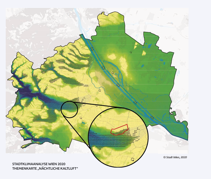 Bei der Stadtplanung und insbesondere bei der Festlegung von Flächenwidmungsplänen hat die Berücksichtigung von Kaltluftströmen, die in die Stadt Wien fließen, in den letzten Jahren an Bedeutung gewonnen. Durch Bebauung von Freiflächen können Kaltluftströme abgeschwächt werden. Das Funktionieren der Kaltluftströme ist aber, auch aufgrund der Klimaerwärmung, immens wichtig. Sie sorgen für die nächtliche Abkühlung, können Hitzeperioden verkürzen und führen vor allem zu einer Reduktion der Anzahl der Tropennächte.
