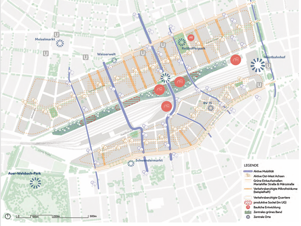 - Die Flächen gehören den ÖBB. Um einen Park dieser Größe zu ermöglichen, braucht es einen Ausgleich zwischen Grün- und Freiflächen und ergänzenden Nutzungen (z. B. Wohnen, Bildung, Arbeiten).