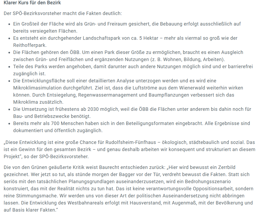 Westbahnpark: Faktencheck zur Presseinformation der SPÖ