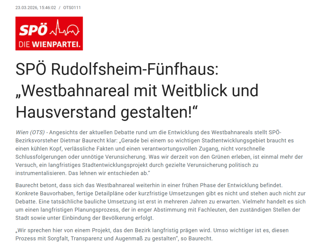 - Angesichts der aktuellen Debatte rund um die Entwicklung des Westbahnareals stellt SPÖ-Bezirksvorsteher Dietmar Baurecht klar: „Gerade bei einem so wichtigen Stadtentwicklungsgebiet braucht es einen kühlen Kopf, verlässliche Fakten und einen verantwortungsvollen Zugang, nicht vorschnelle Schlussfolgerungen oder unnötige Verunsicherung.