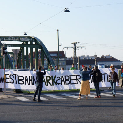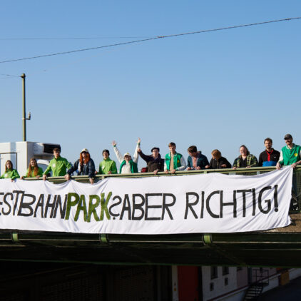 Die geplante Verbauung des Westbahngeländes sorgt weiterhin für Ärger und Sorgen bei den Anrainer:innen im 15. Bezirk. Mit einem zehn Meter langen Transparent mit der Aufschrift „Westbahnpark? Aber richtig!“ protestierten wir Grünen Rudolfsheim-Fünfhaus bei der Schmelzbrücke gegen die aktuellen Pläne der Stadtregierung.
