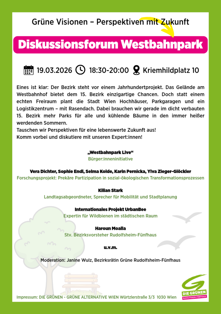 Donnertag 19.3. 18:30h – 20h Parteibüro der Grünen Rudolfsheim-Fünfhaus – Kriemhildplatz 10/1 1150 Wien